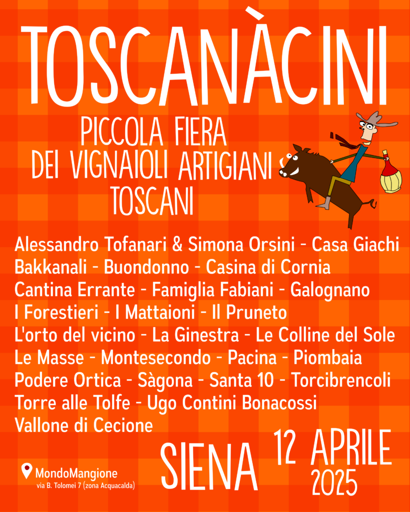 La seconda edizione di Toscanàcini, prima fiera dedicata ai vignaioli artigiani toscani della città di Siena, si svolgerà sabato 12 aprile 2025 a MondoMangione, con tanti produttori locali, degustazioni, buon cibo, musica ed eventi.
