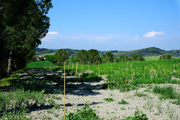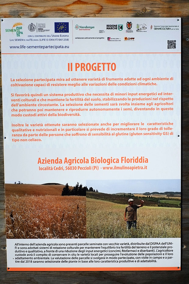 E la fertilità del terreno? Viene garantita dalle rotazioni colturali, che qui sono triennali: su uno stesso campo viene seminato un anno il grano, un anno legumi, un anno piante da sovescio, ossia piante che verranno falciate e mescolate al terreno per nutrirlo. Solo dal quarto anno tornerà il grano. È ormai risaputo che il regime di monocoltura intensiva è uno dei maggiori fattori di impoverimento del suolo; le rotazioni assicurano invece la conservazione della naturale fertilità del terreno: grazie a questo, a Floriddia non si pratica alcun tipo di concimazione, nemmeno organica.